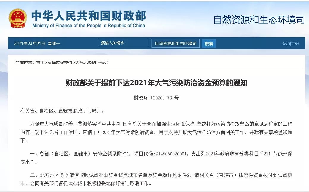 2020年底財政部提前發布《關于提前下達2021年大氣污染防治資金預算的通知》,資金撥付總計達150億元人民幣。